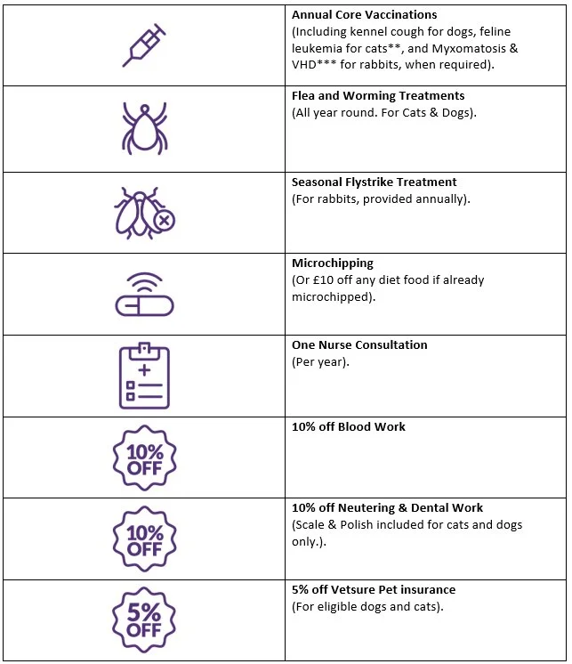 This is why we want to help reduce and spread the cost of routine preventative healthcare for your pet. We’re working with our Pet Health Plan administrators, Vetsure, to deliver preventative treatments and benefits for dogs, cats and rabbits, all at discounted prices that are collected in an easy monthly direct debit.
